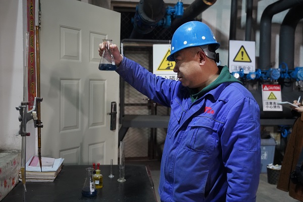 在水化A車間,劉丁一穿上工作服,戴上防護(hù)用具,立刻進(jìn)入工作狀態(tài)?;?yàn)工作枯燥乏味,但對(duì)質(zhì)量的要求卻精益求精,從接樣到測(cè)量再到數(shù)據(jù)分析,他嫻熟地倒著試劑、觀察著試劑瓶,一支燒瓶、一些水、幾滴試劑,隨著劉丁一搖晃的燒瓶,漸漸的,瓶子中的水從紫紅色,變成了淺藍(lán)色。為了檢驗(yàn)軟化水的質(zhì)量是否達(dá)標(biāo),確保鍋爐一次網(wǎng)用水安全,這一天他要對(duì)水質(zhì)至少進(jìn)行8次檢驗(yàn)。