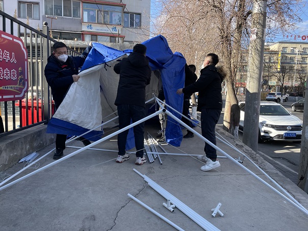 連日來(lái),公司的近百名員工陸續(xù)被派往社區(qū)一線支援疫情防控工作,事務(wù)管理中心安排專(zhuān)人和他們保持聯(lián)系,及時(shí)把一次性醫(yī)用外科口罩、N95口罩、防護(hù)服、防護(hù)手套、隔離面罩等疫情防控物資送到各個(gè)值守點(diǎn)。2月28日,事務(wù)管理中心主任胡夢(mèng)園、黨支部書(shū)記劉紅梅在電子路社區(qū)值守點(diǎn)查看時(shí),發(fā)現(xiàn)當(dāng)班的員工在寒風(fēng)中堅(jiān)守著,及時(shí)為他們搭建了帳篷,送來(lái)了電暖氣。