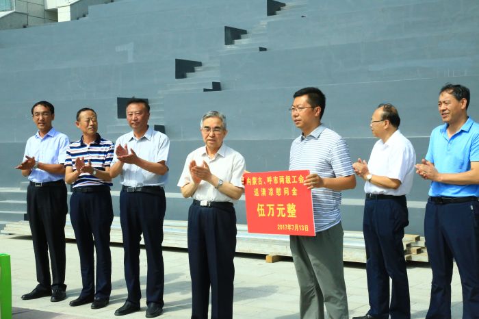 7月13日,內(nèi)蒙古自治區(qū)人大常委會副主任、總工會主席杭桂林,呼和浩特市政府副巡視員、黨組成員劉敏,市人大常委會副主任、總工會主席斯欽畢力格等一行向奮戰(zhàn)在我市重大項目重點工程內(nèi)蒙古少數(shù)民族群眾文化體育運(yùn)動中心一線施工現(xiàn)場的工作人員進(jìn)行送清涼慰問,發(fā)放5萬元慰問金,表達(dá)了兩級政府對我市重大項目重點工程一線單位職工的深切問候和關(guān)懷。城發(fā)公司董事長、黨委書記張瑞平,黨委副書記、工會主席張永等領(lǐng)導(dǎo)陪同。文\陳柯羽
