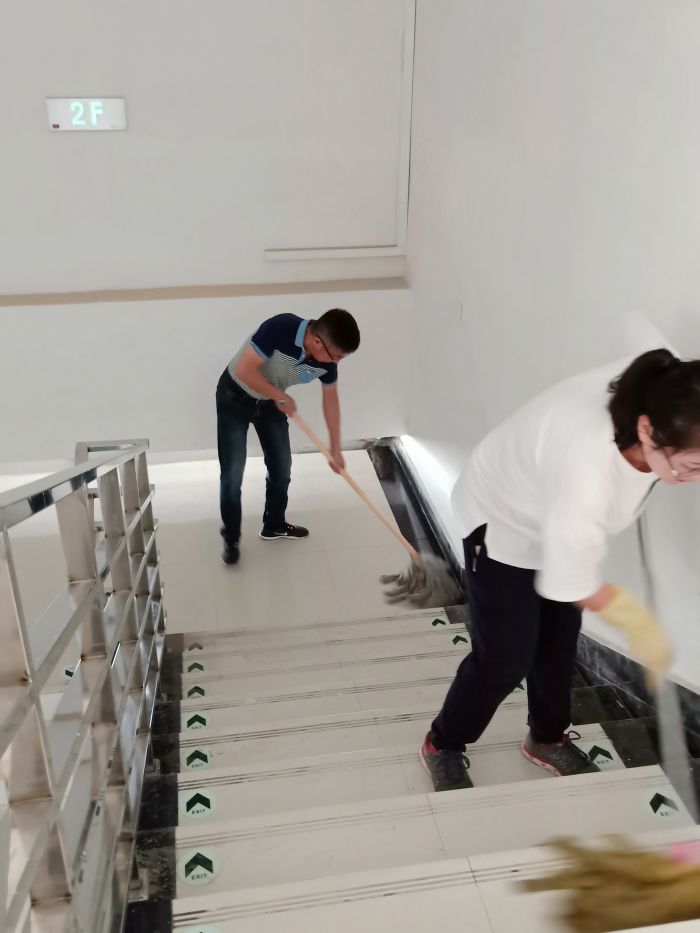 主站樓部分是攻堅(jiān)之戰(zhàn),30位員工在透明的頂棚下感受悶熱灼曬、揮汗如雨,每一塊地磚都是經(jīng)過了水沖、塵推、除塵、清洗、抹凈、擦干等六道工序,方可達(dá)標(biāo)。上下兩層共26912平方米,經(jīng)過兩天半的時(shí)間終于完工,看著光亮如新、纖塵不染的候車廳,所有員工的臉上都綻放了發(fā)自內(nèi)心的微笑。
